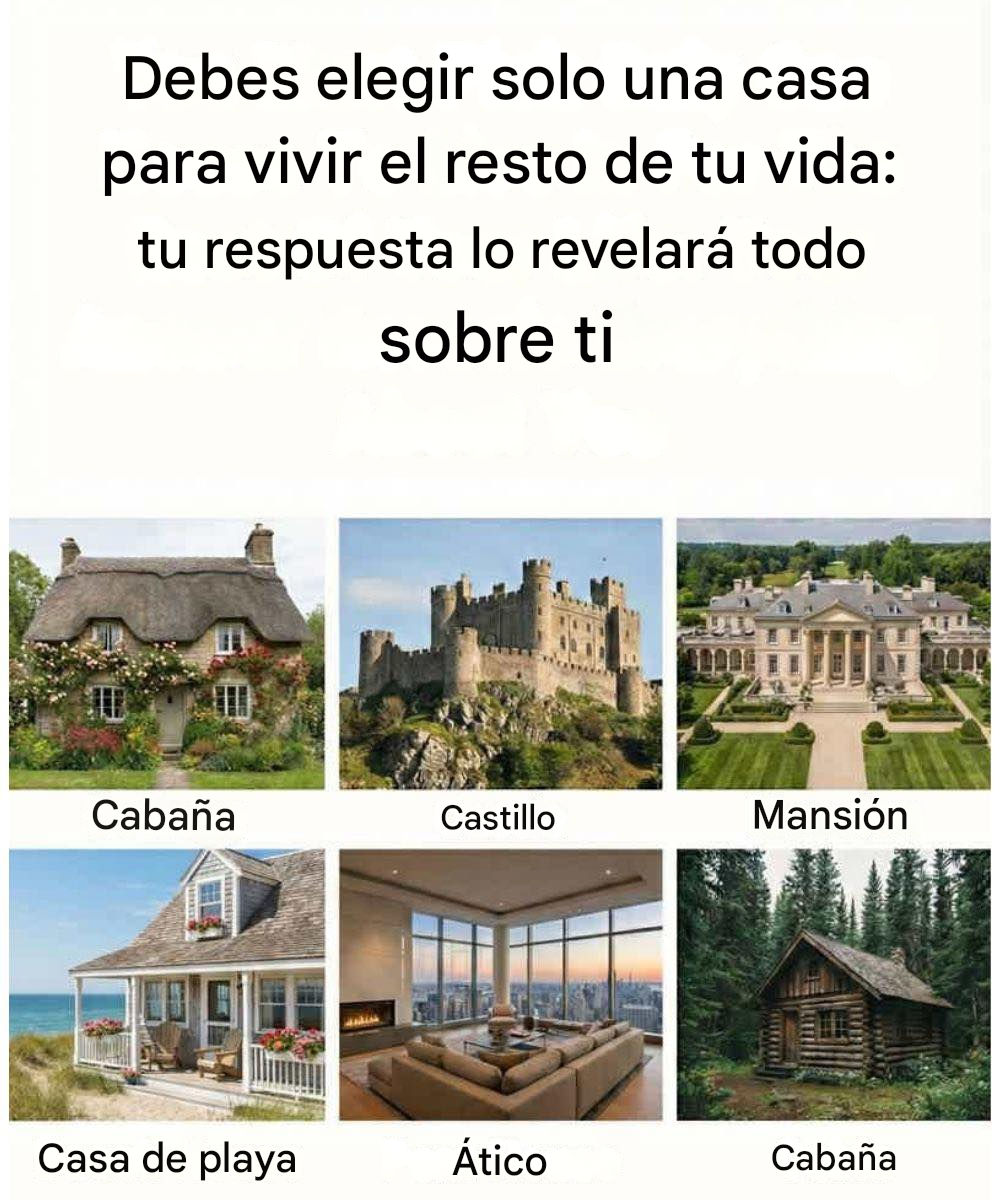 A primera vista, esta pregunta parece simple, casi lúdica. Una casa de campo, un castillo, una mansión, una casa de playa, un ático o una cabaña. Solo una opción. Pero lo cierto es que la casa que te atrae dice mucho más de ti que tu gusto arquitectónico. Refleja tus valores, tus necesidades emocionales y cómo ves tu lugar en el mundo.