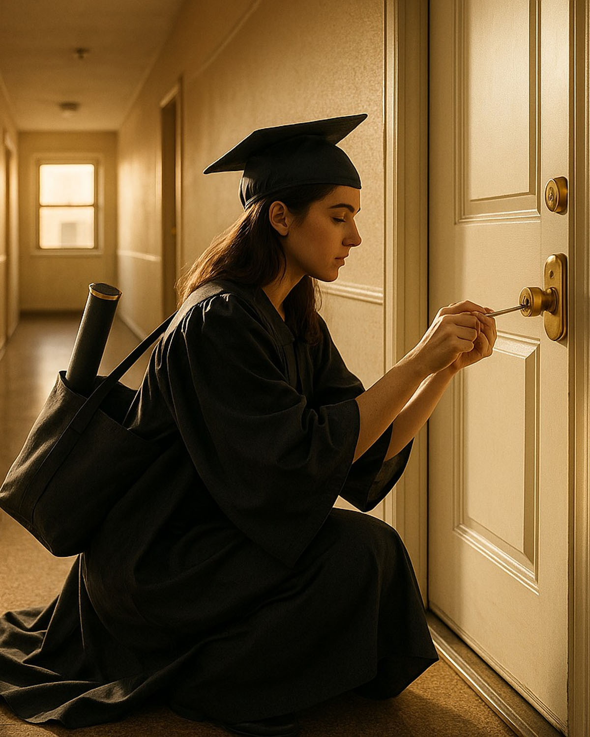 Después, me quedé en el patio, revisando mi teléfono solo para parecer ocupada. Ruby, mi compañera de clase, me encontró y chilló: “¡Lo lograste!”. Sus padres nos tomaron fotos juntas, radiantes. Ella se giró, escaneando la multitud. “¿Dónde está tu familia? ¿Llegan tarde?”. “Sí”, mentí. La mentira salió fácil. Años de práctica.