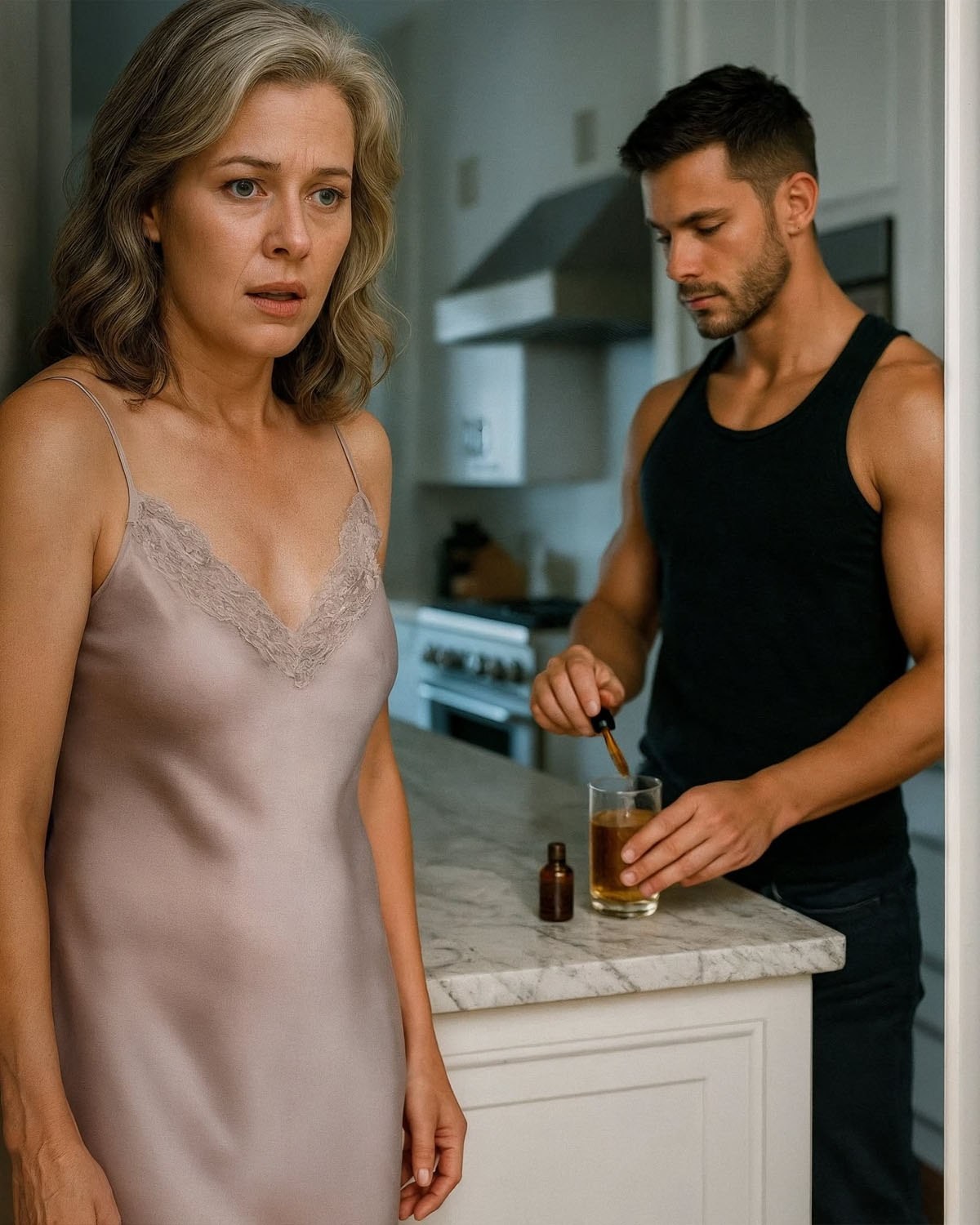 Una noche, Ethan me dijo que se quedaría despierto hasta tarde para preparar un «postre de hierbas» para sus amigos de yoga. «Duerme tú primero, bebé», dijo, besándome la frente. Asentí, apagué la luz y finguí dormirme. Pero algo dentro de mí —una vocecita terca— se negó a callarse. Me levanté sin hacer ruido y bajé por el pasillo. Desde el umbral de la puerta, observó a Ethan en la cocina. Estaba de pie junto a la encimera, tarareando suavemente. Lo vi verter agua tibia en mi vaso de siempre, abre un cajón y saca un pequeño frasco de color ámbar. Lo inclinó —una, dos, tres gotas de un líquido transparente— en mi vaso. Luego agregó la miel, la manzanilla y removió. Todo mi cuerpo se heló. Cuando terminó, cogió el vaso y subió las escaleras, hacia mí. Me deslicé de nuevo en la cama y finmí estar medio dormida. Sonrió mientras me tendía el vaso. «Toma, bebé». Bostecé y susurré suavemente: «Me lo terminaré más tarde». Esa noche, cuando él se durmió, vertí el agua en un termo, lo sellé y lo escondí en mi armario.